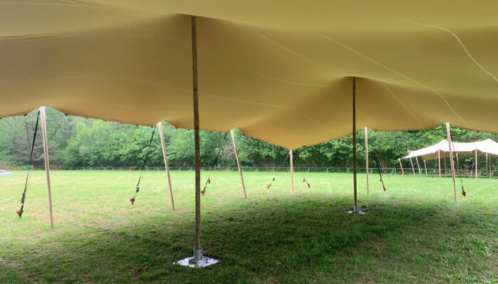 La tente stretch, aussi appelée tente nomade, est une toile stretch robuste tendue sur des mâts en bois. Durable, la toile stretch est conçue pour résister aux intempéries et est fabriquée à partir de matériaux de haute qualité qui garantissent sa solidité. Le tissu stretch est également réfléchissant et permet la réverbération des rayons du soleil.
