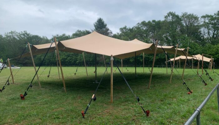 Disponible en différentes tailles (10m par 10m, 10m par 15m, et jusqu’à 30m par 15m), la tente stretch est installée piquée et haubanée sur sol meuble. Sur sol non piquetable, le lestage de la tente est réalisé avec des lests en béton.